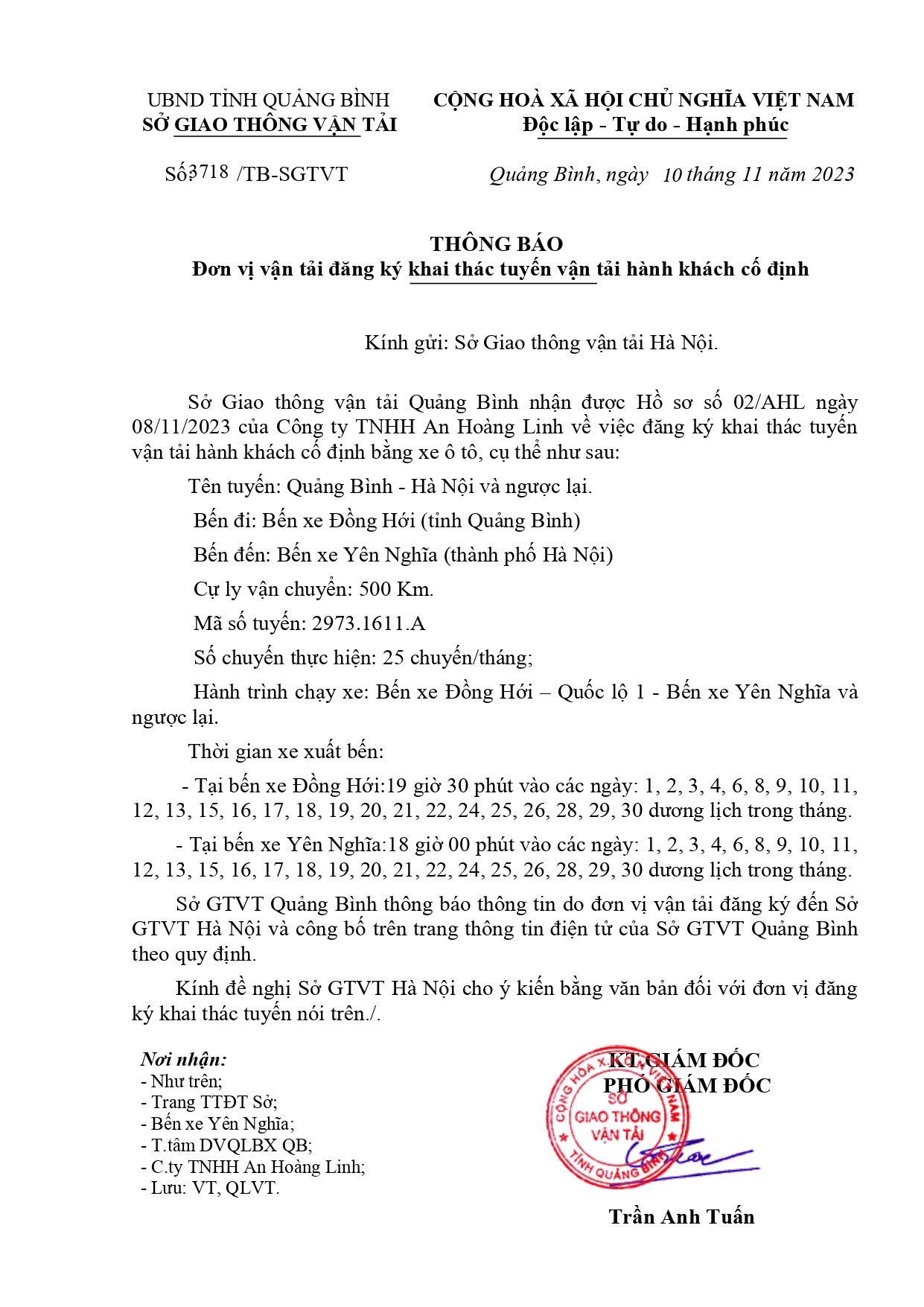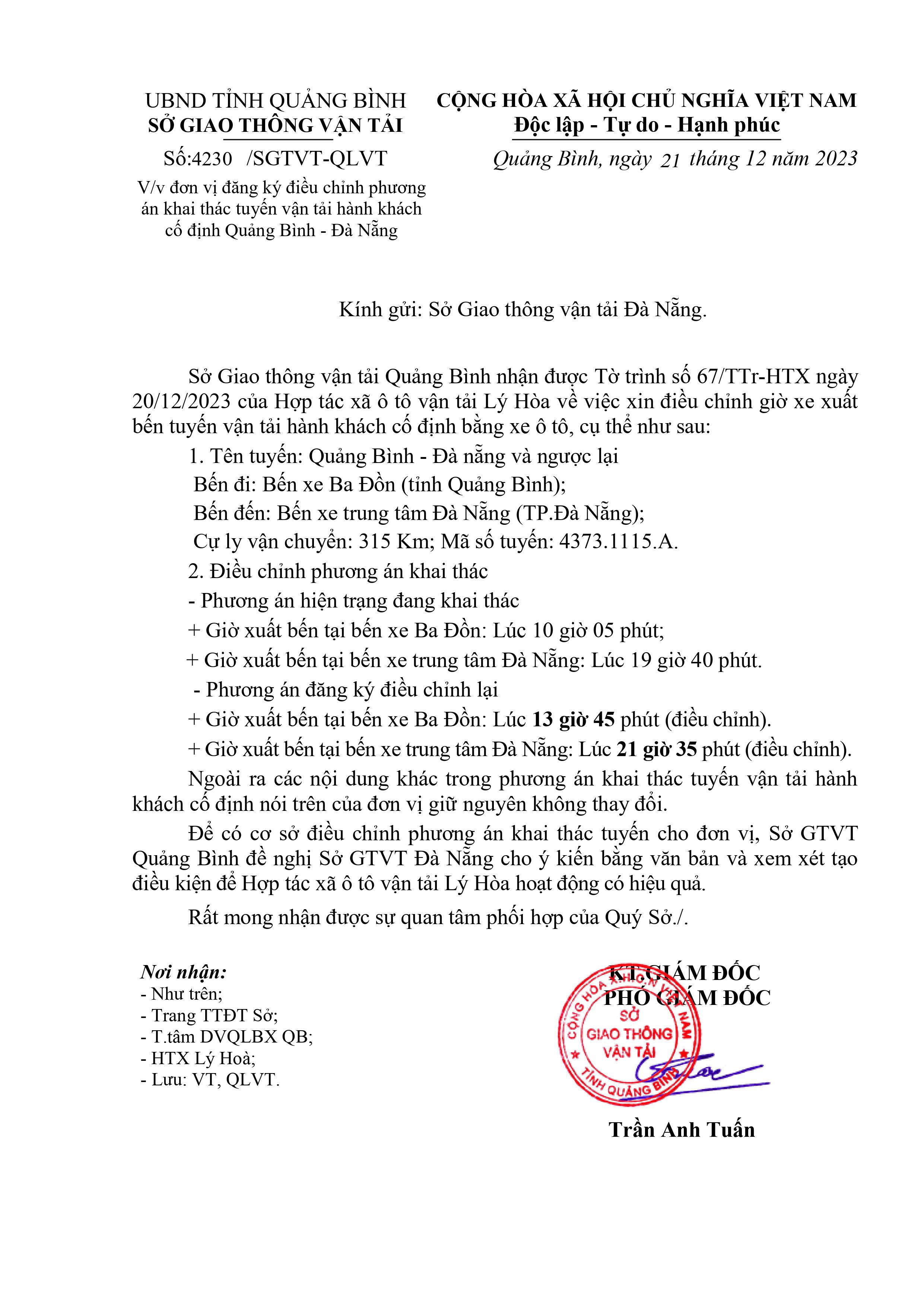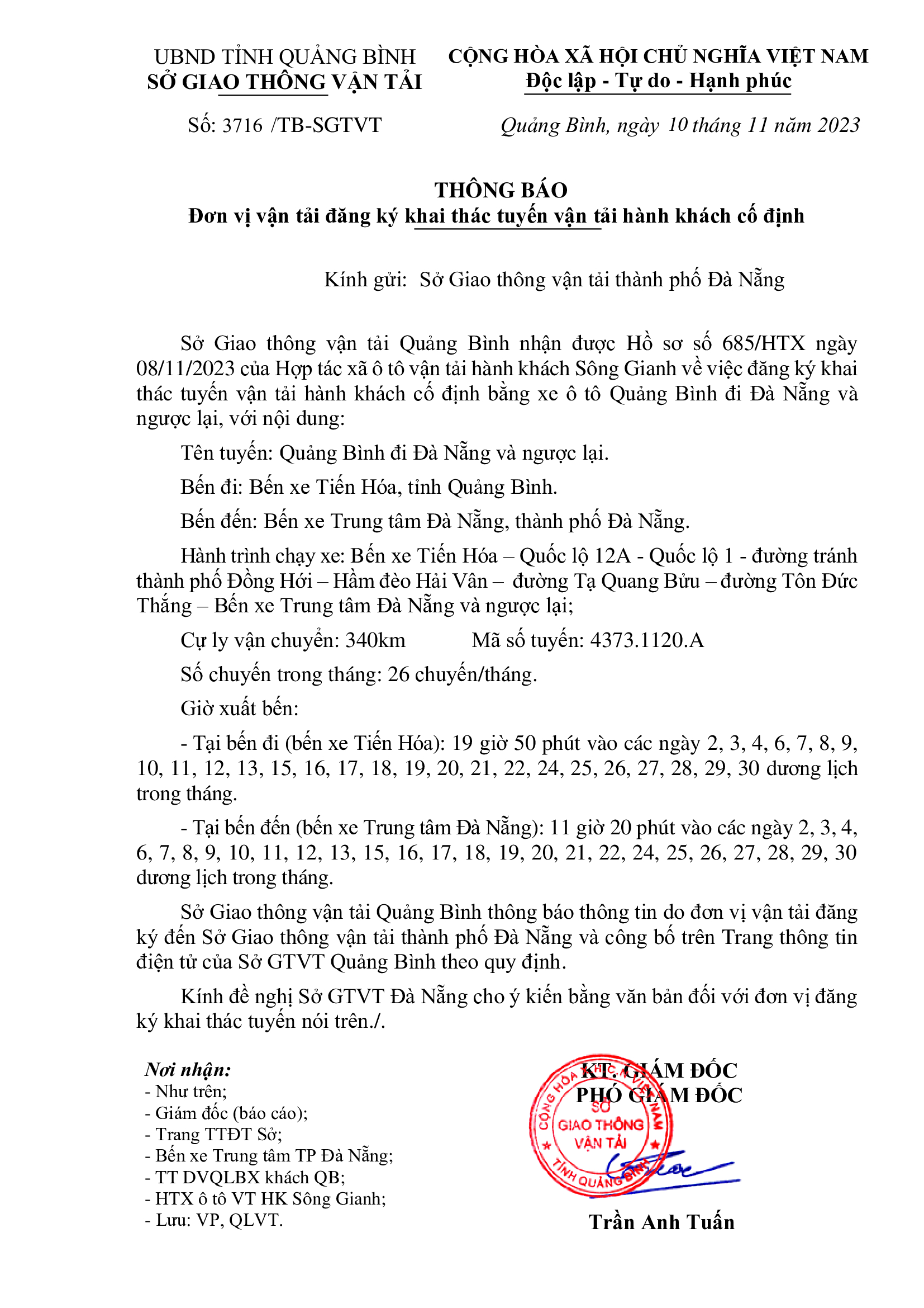 Thông báo điều chỉnh phương án khai thác tuyến vận tải hành khách cố định