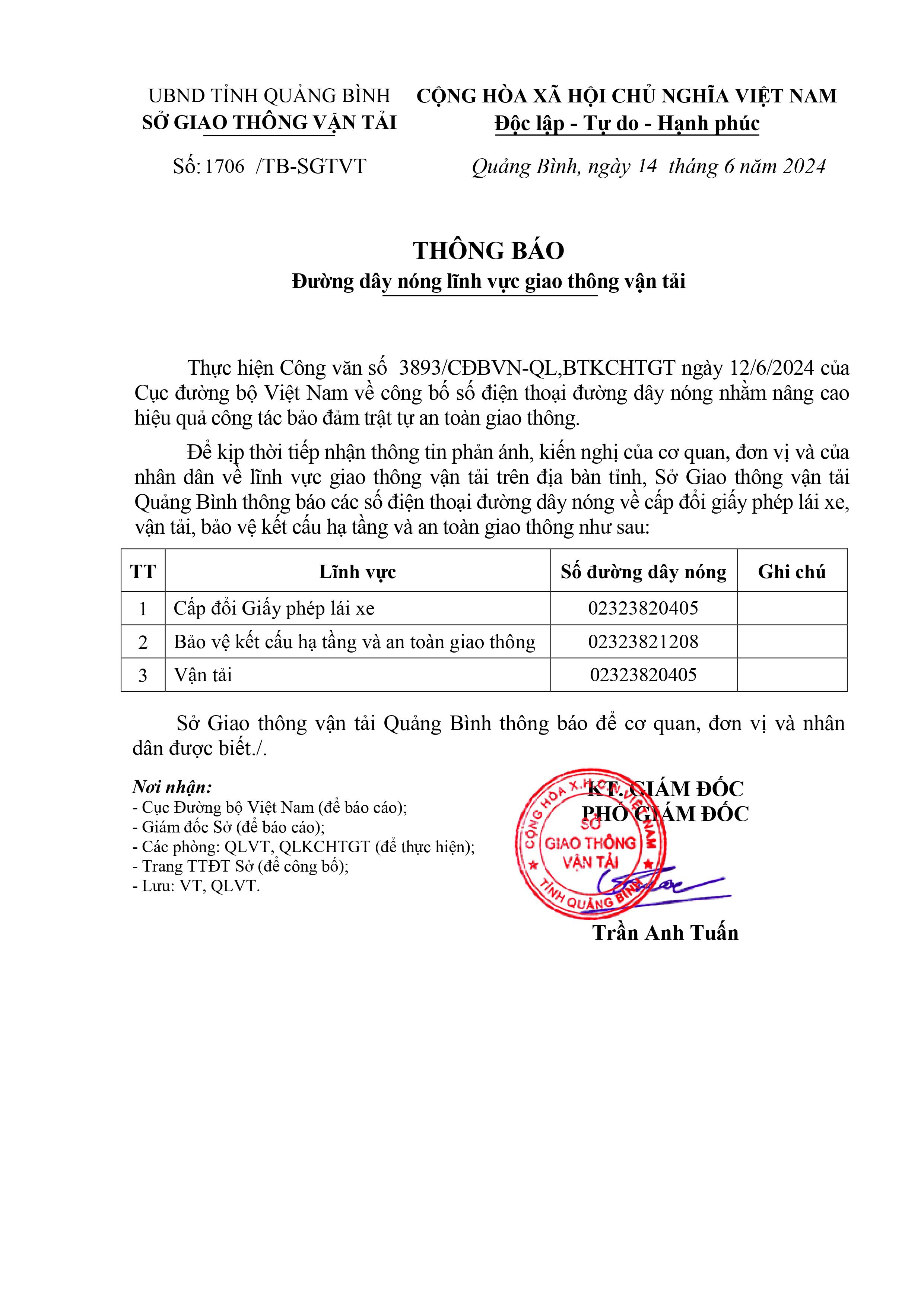 Thông báo đường dây nóng lĩnh vực giao thông vận tải
