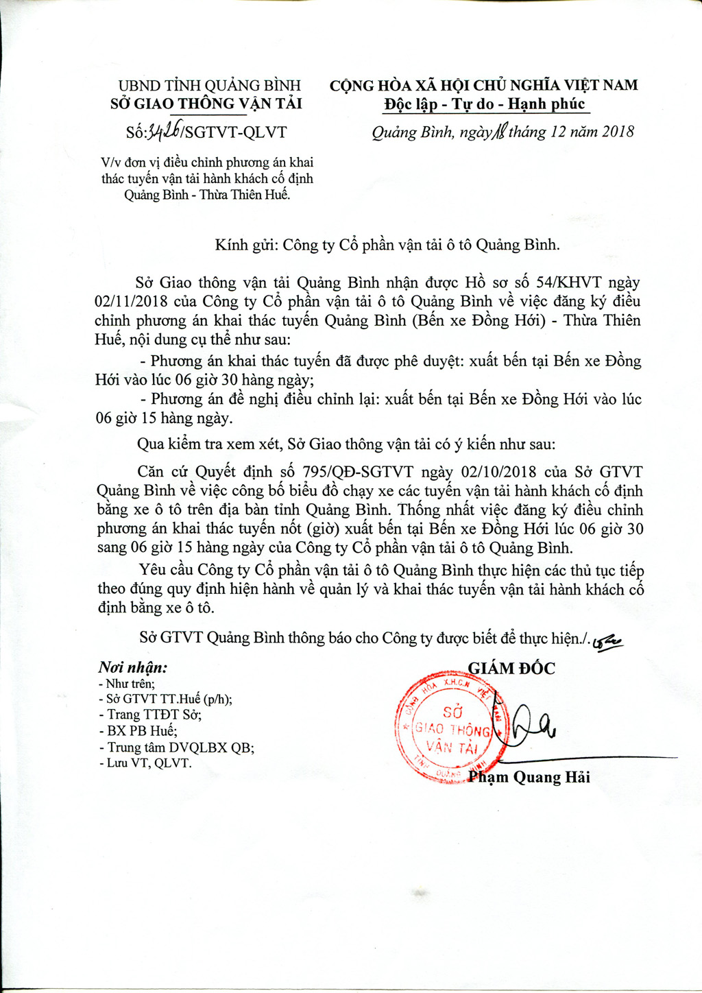 Thông báo Điều chỉnh phương án khai thác tuyến vận tải hành khách cố định liên tỉnh của Công ty Cổ phần vận tải ô tô Quảng Bình (Tuyến Quảng Bình - Thừa Thiên Huế và ngược lại)