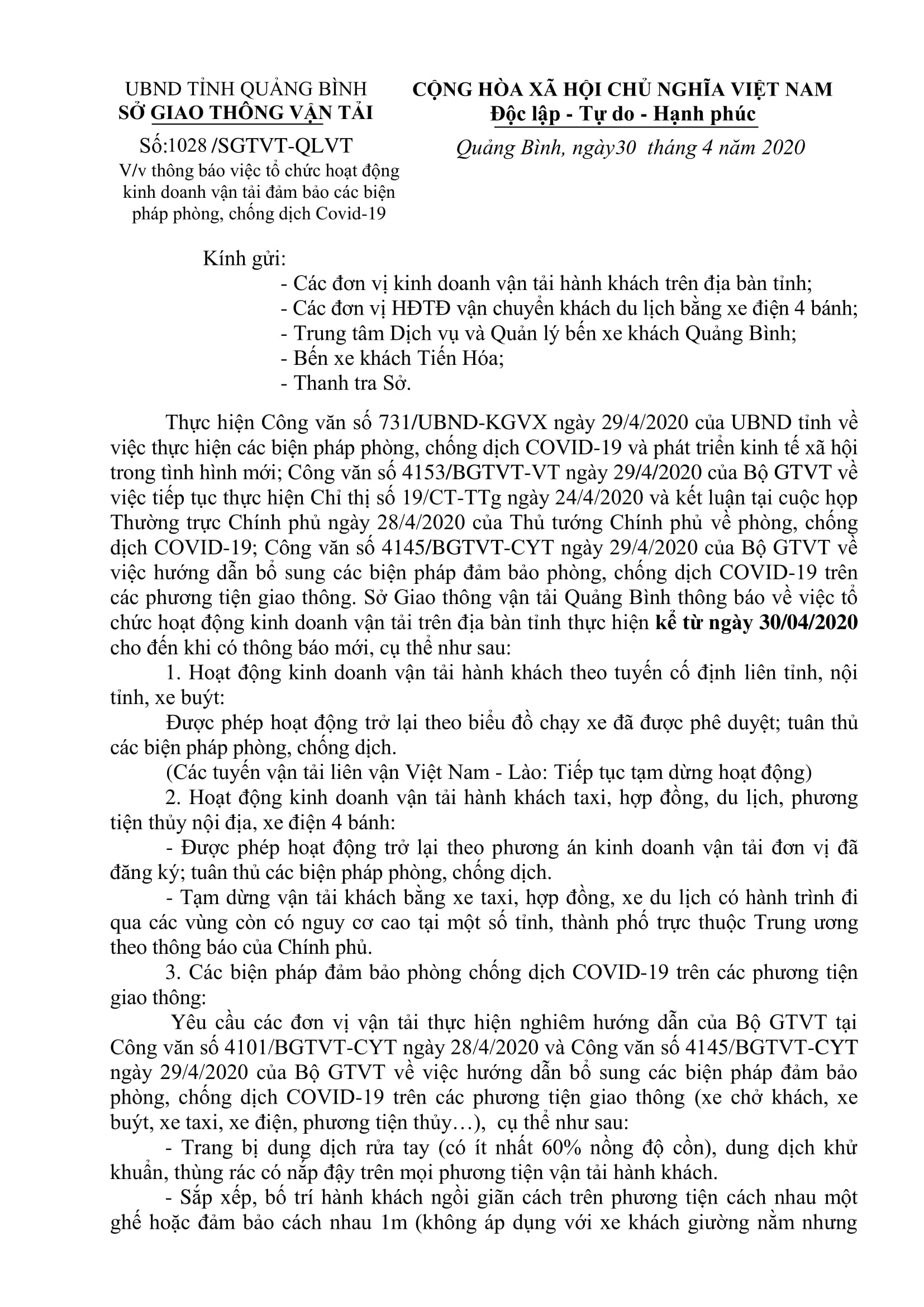 Thông báo việc tổ chức hoạt động kinh doanh vận tải đảm bảo các biện pháp phòng, chống dịch Covid-19