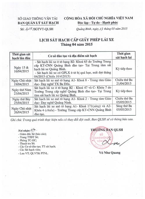 Lịch sát hạch cấp Giấy phép lái xe tháng 04 năm 2015