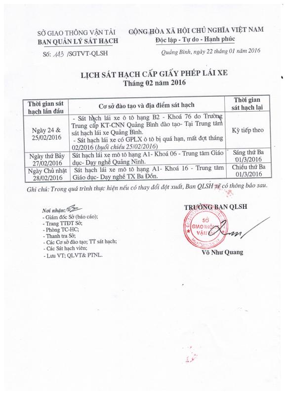 Lịch sát hạch cấp Giấy phép lái xe tháng 02 năm 2016