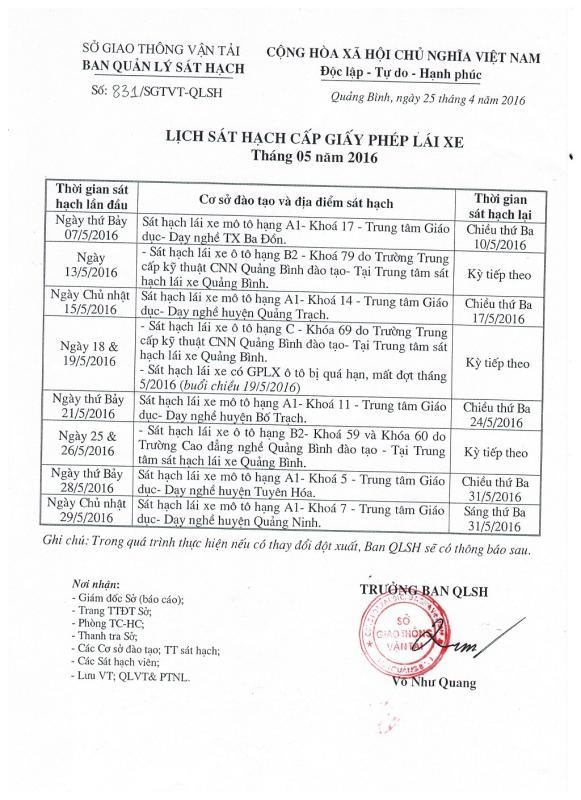 - Lịch sát hạch cấp Giấy phép lái xe tháng 02 năm 2016 (22/01/2016)