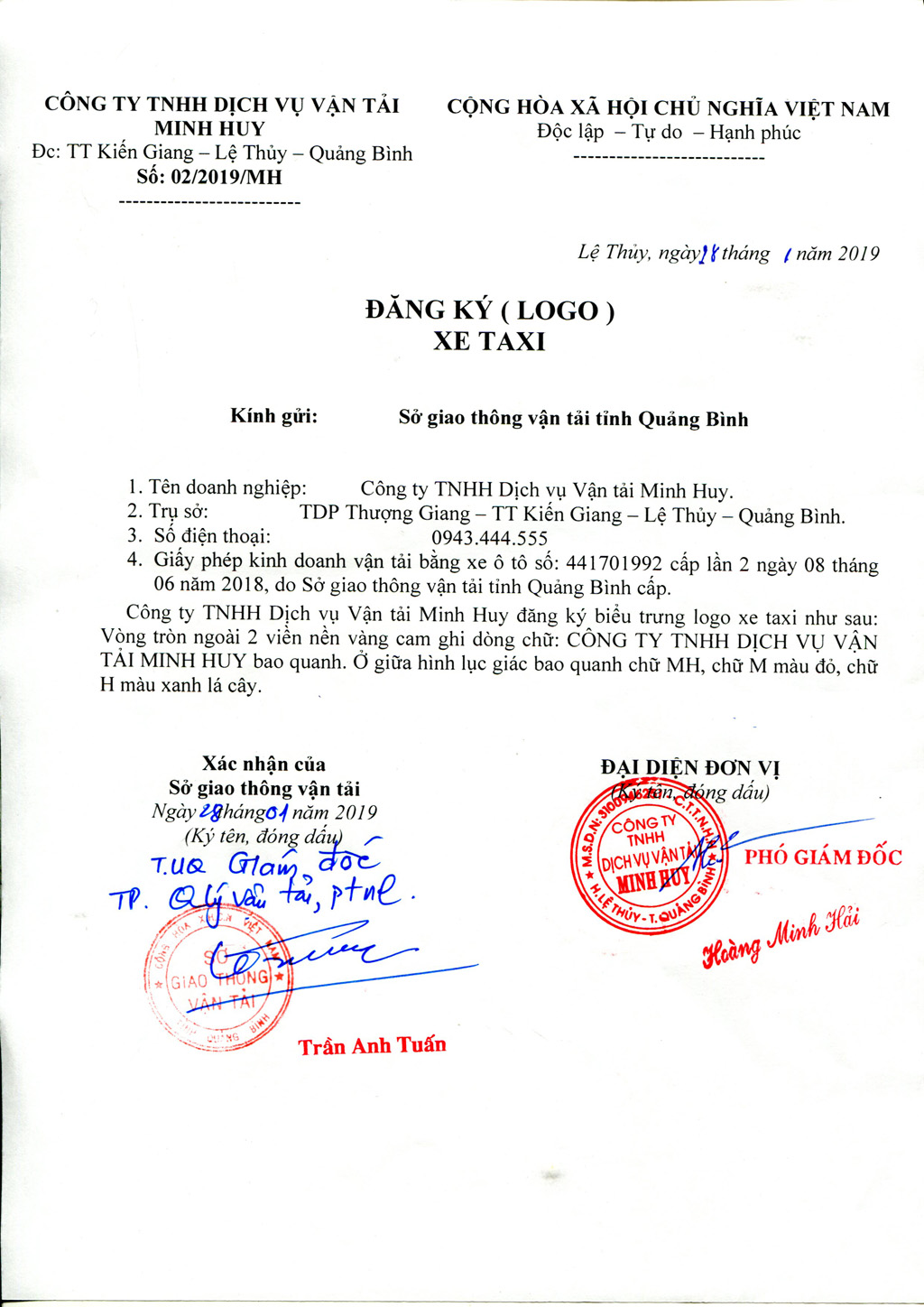 Thông báo Đăng ký Logo xe taxi của Công ty TNHH Dịch vụ vận tải Minh Huy
