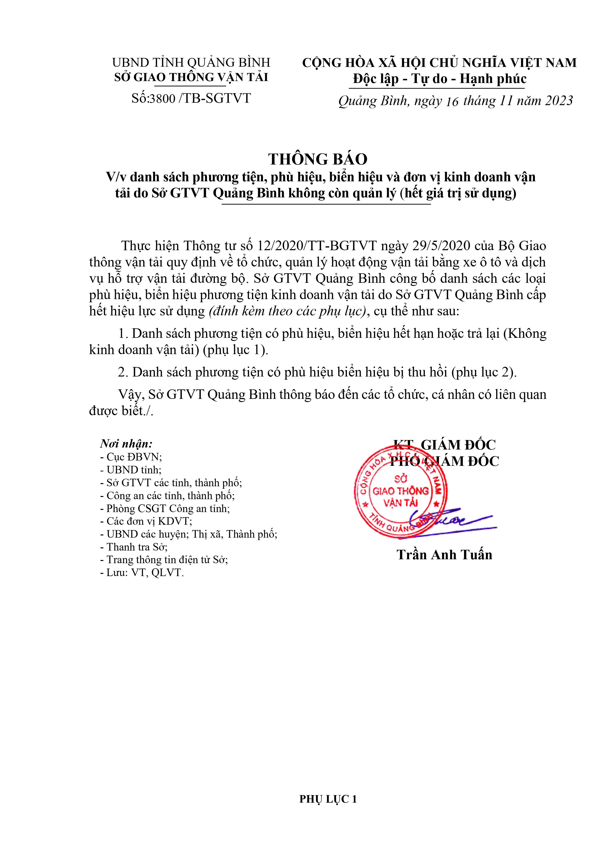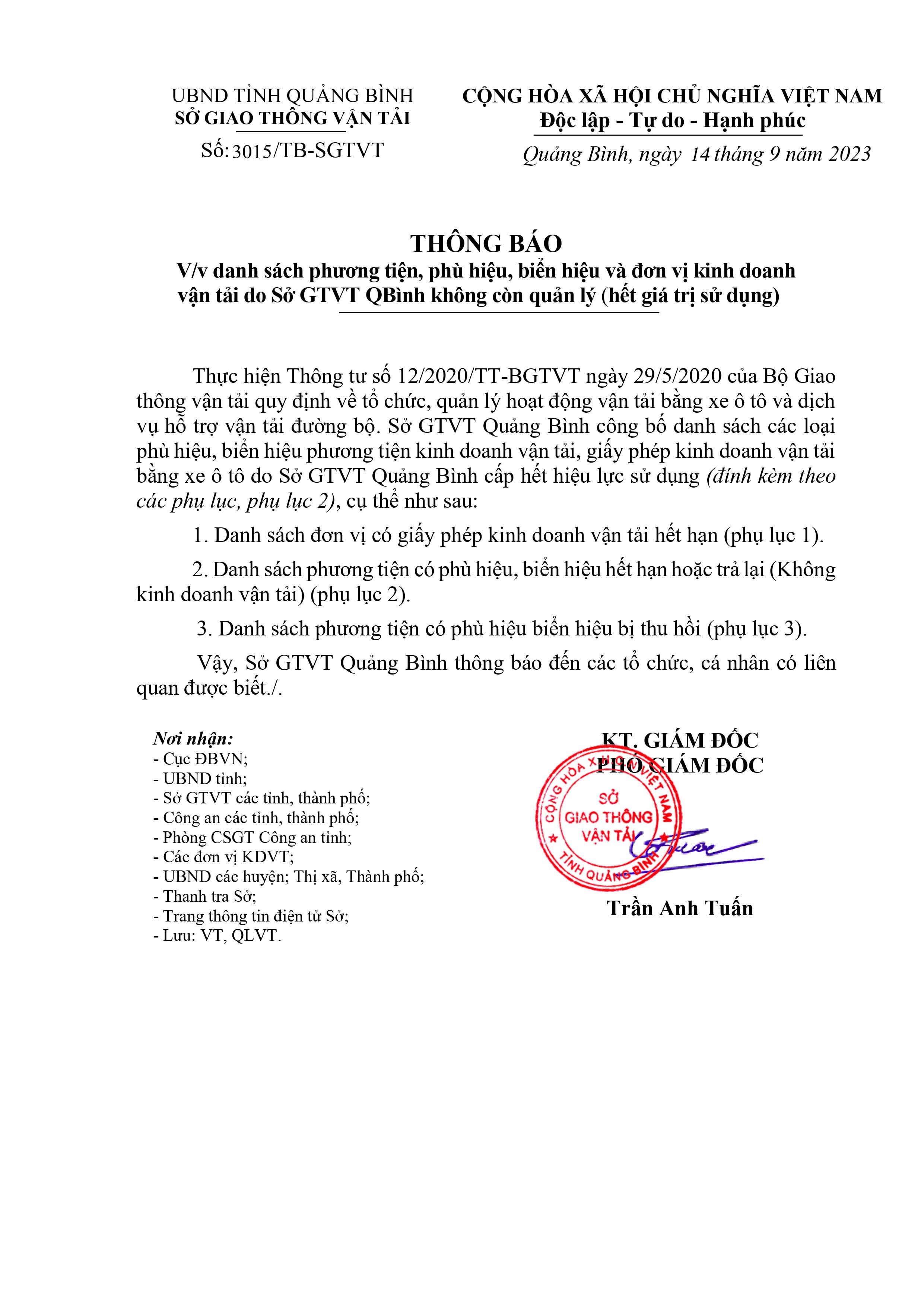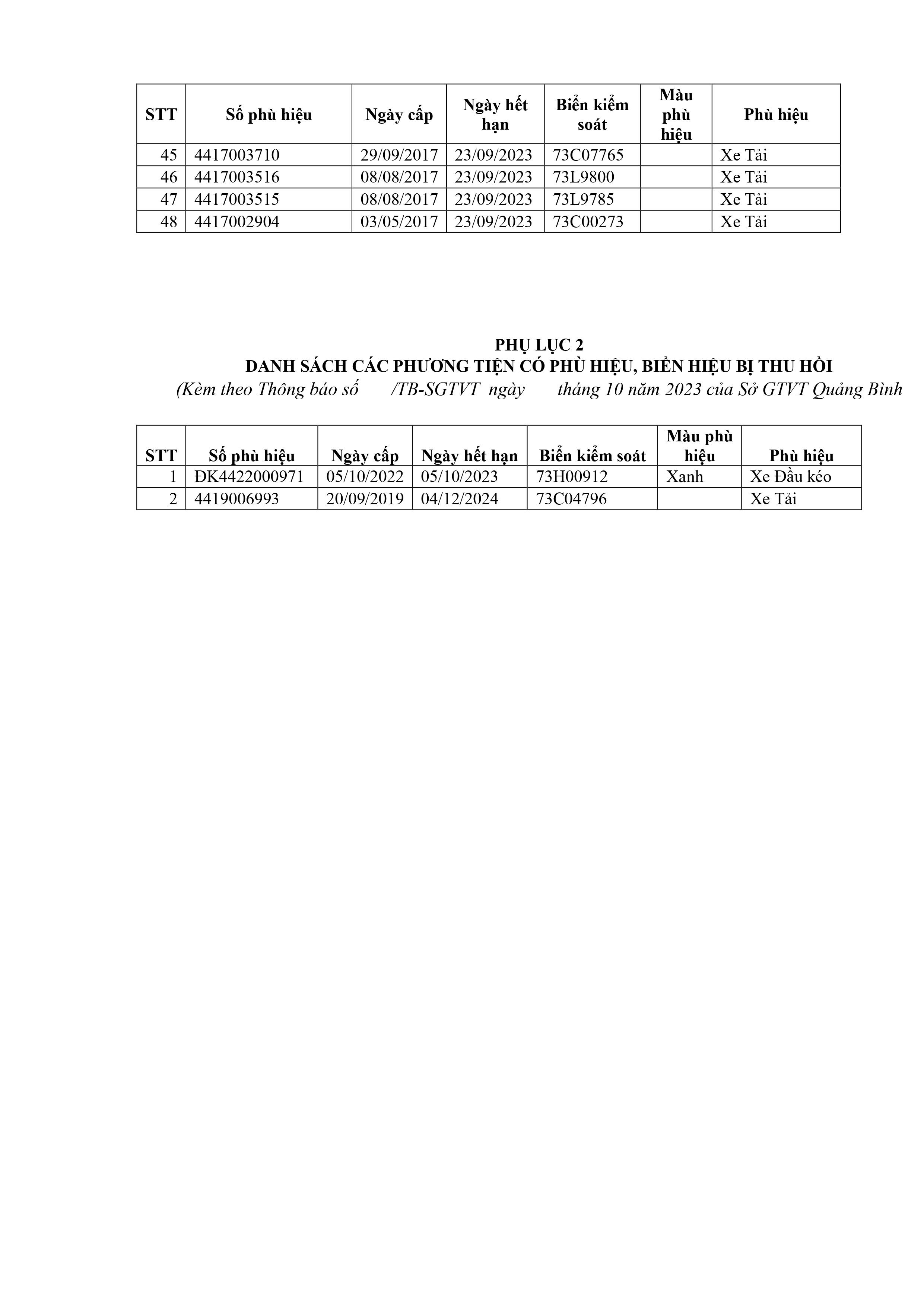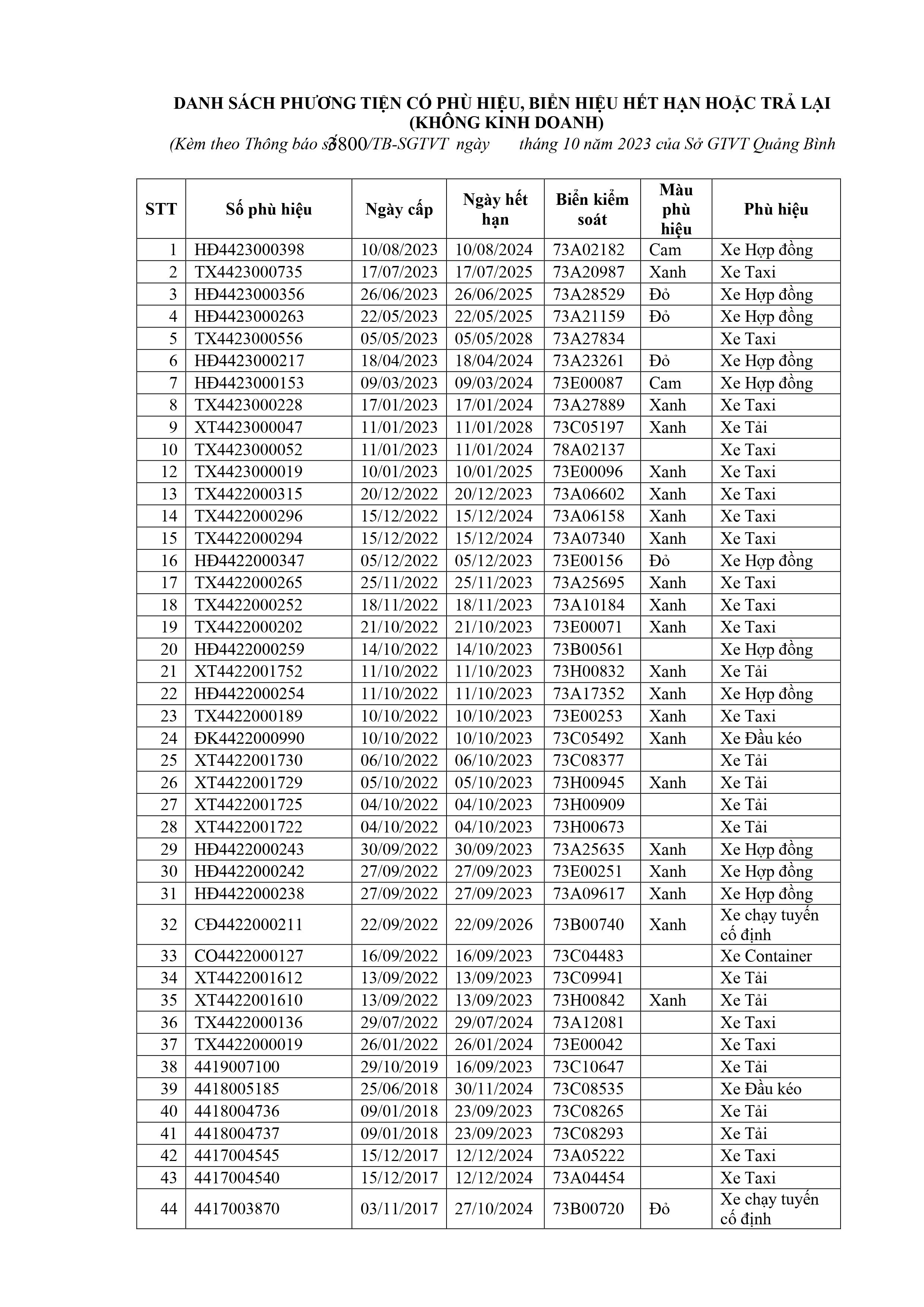Thông báo danh sách phương tiện, phù hiệu, biển hiệu và đơn vị kinh doanh vận tải do Sở GTVT Quảng Bình không còn quản lý (hết giá trị sử dụng)