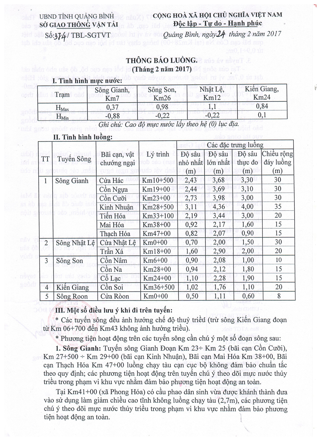 Thông báo luồng Đường thủy nội địa tháng 02/2017