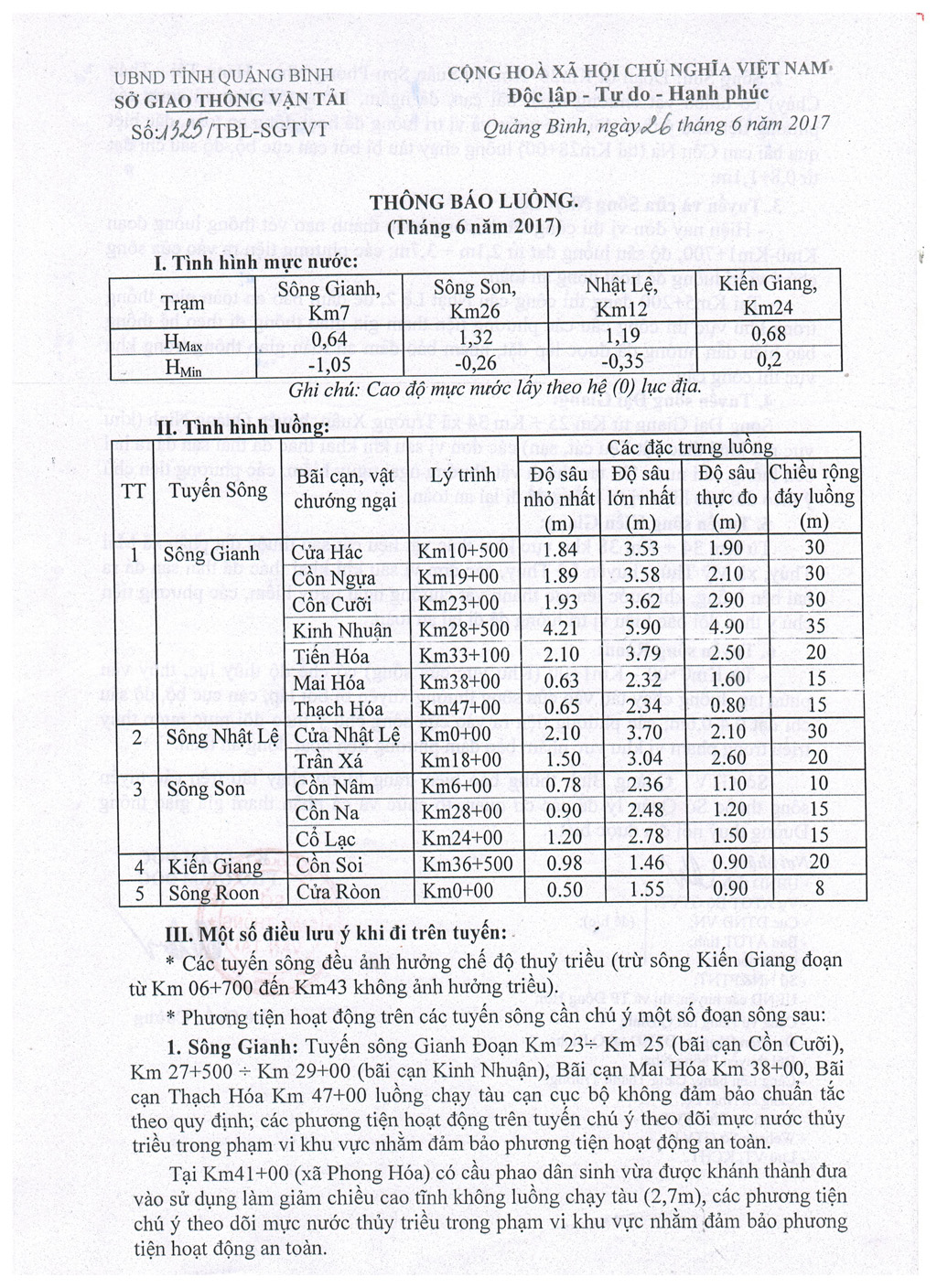Thông báo luồng Đường thủy nội địa tháng 06/2017