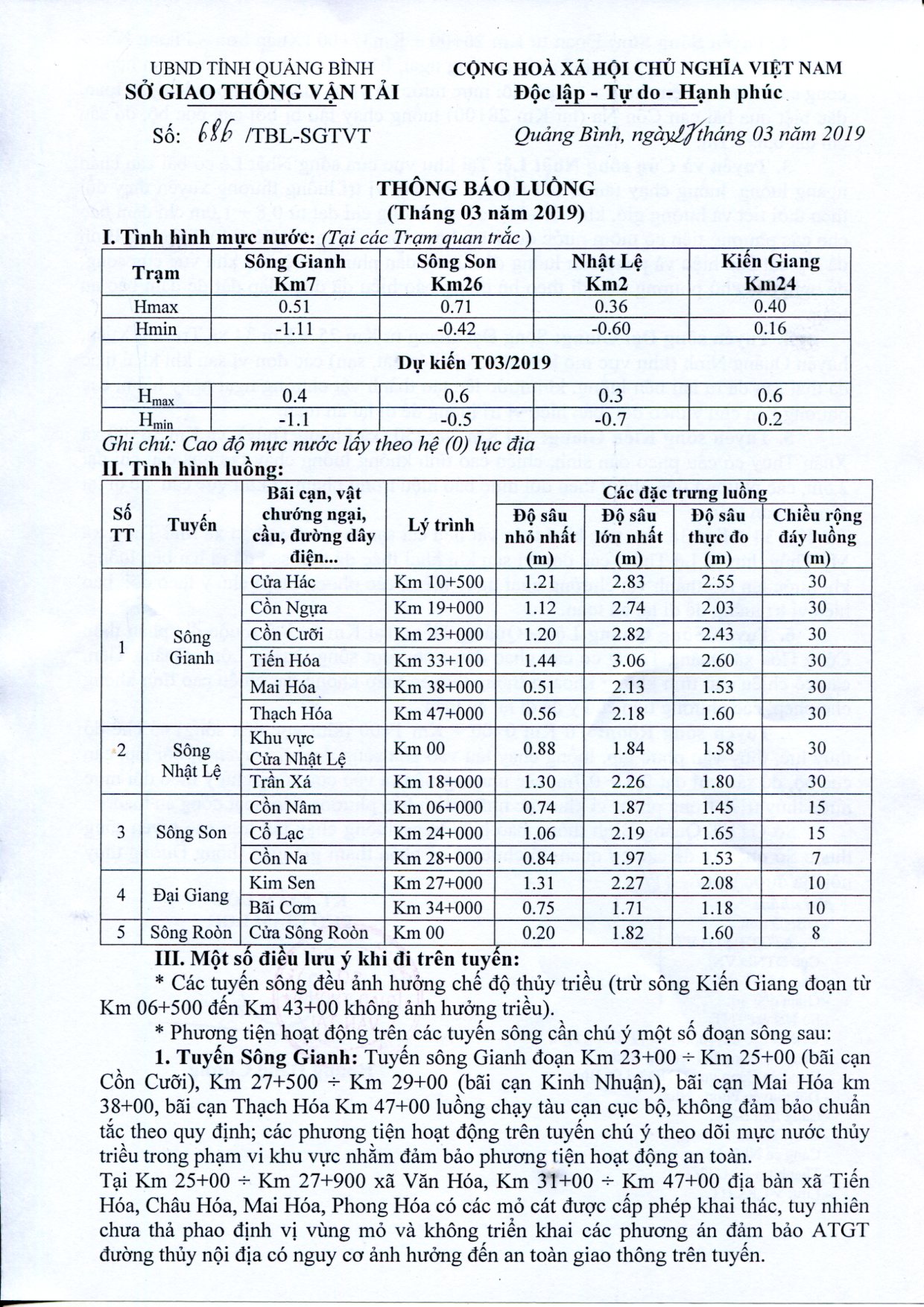 Thông báo luồng Đường thủy nội địa tháng 03/2019