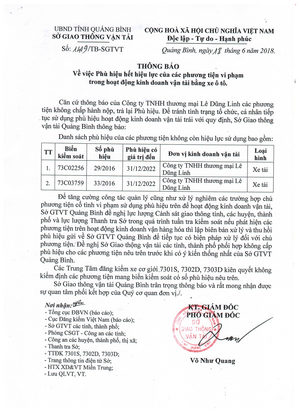 Thông báo về việc Phù hiệu hết hiệu lực của các phương tiện vi phạm trong hoạt động kinh doanh vận tải bằng xe ô tô (Tháng 06/2018)