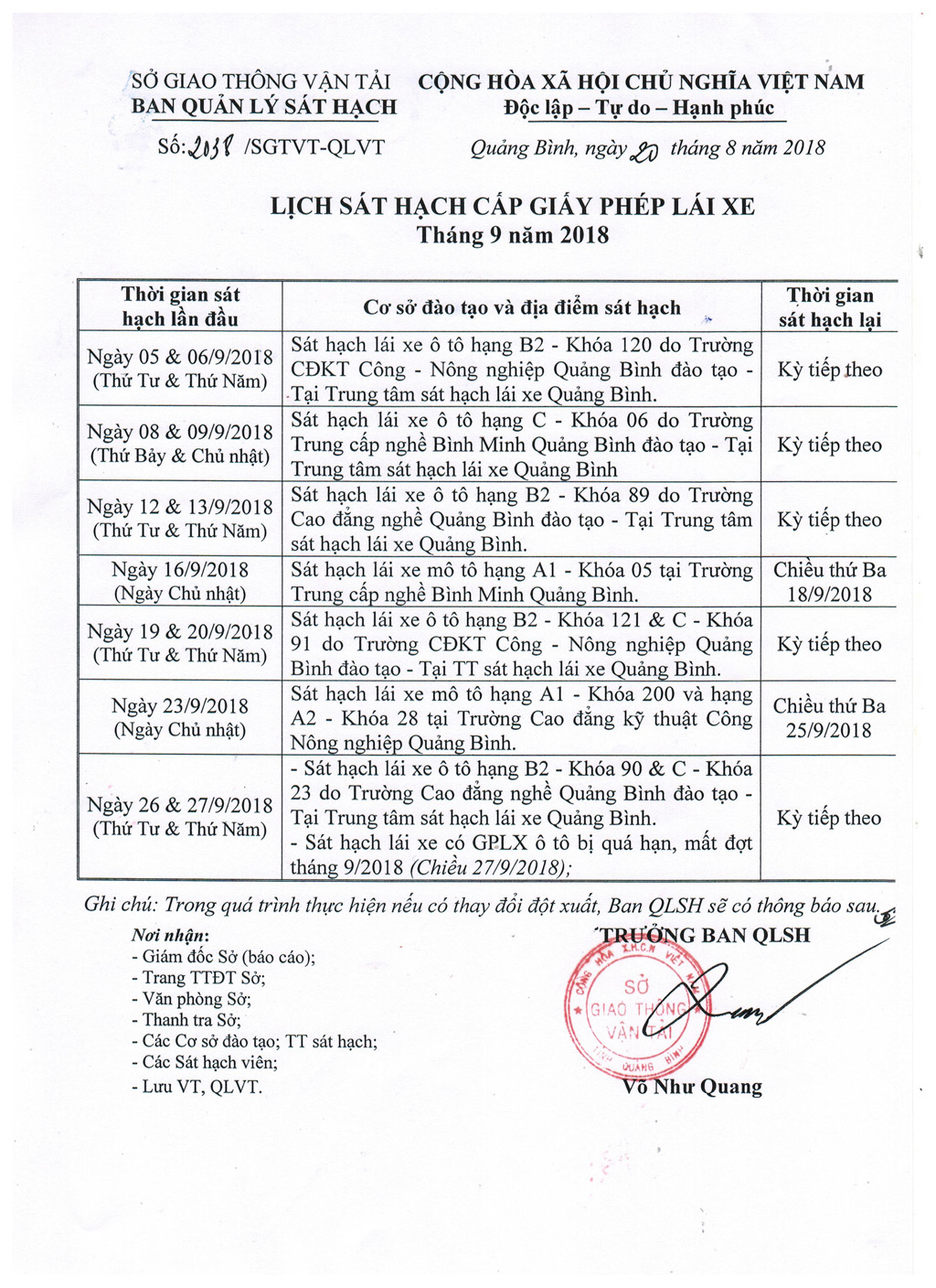 Lịch sát hạch cấp Giấy phép lái xe tháng 09 năm 2018