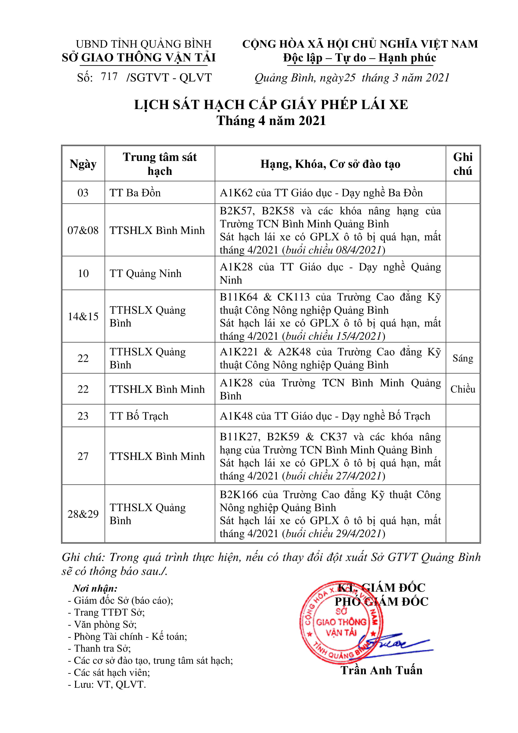 Lịch sát hạch Giấy phép lái xe tháng 04/2021