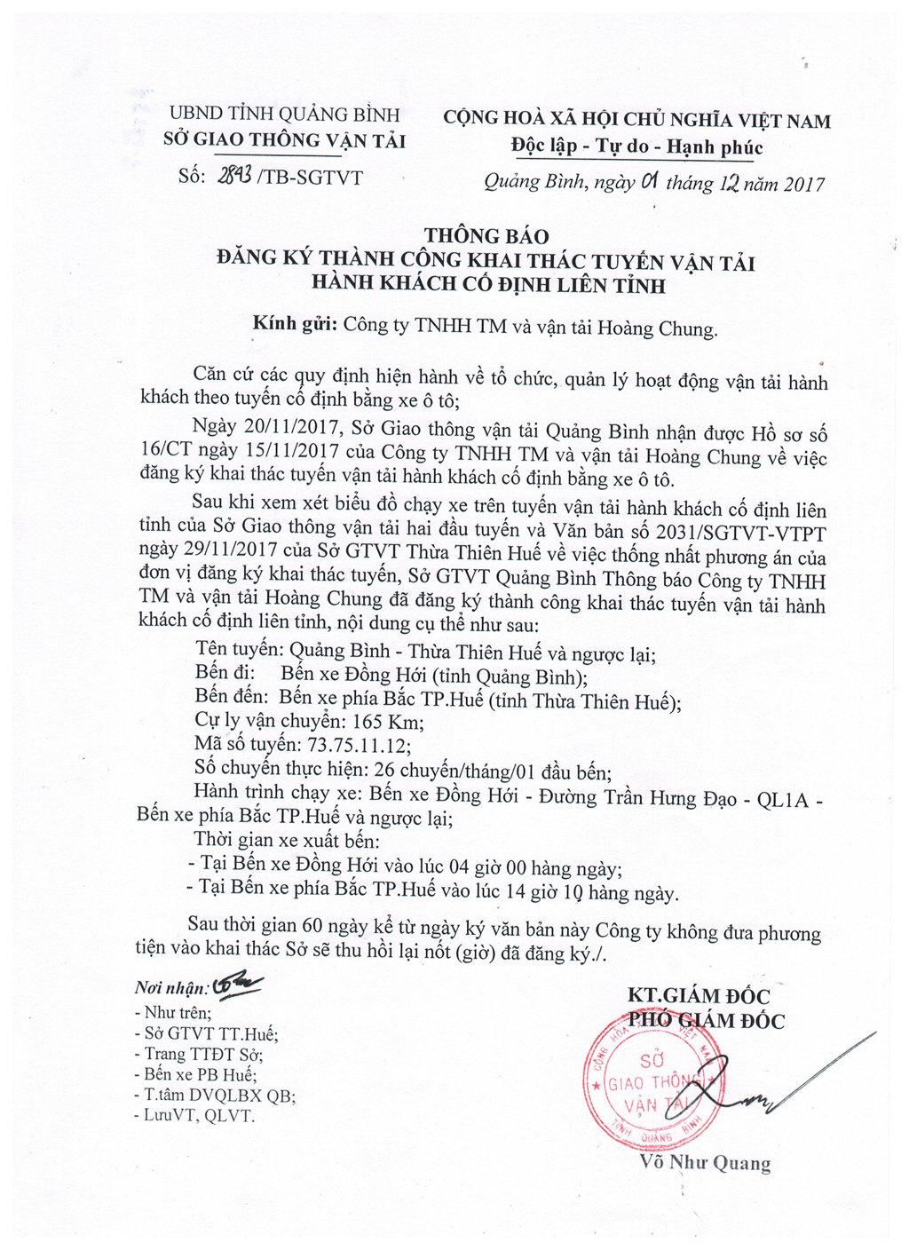 Thông báo Đăng ký thành công khai thác tuyến vận tải hành khách cố định liên tỉnh của Công ty TNHH TM và vận tải Hoàng Chung (tuyến Quảng Bình - Thừa Thiên Huế và ngược lại)